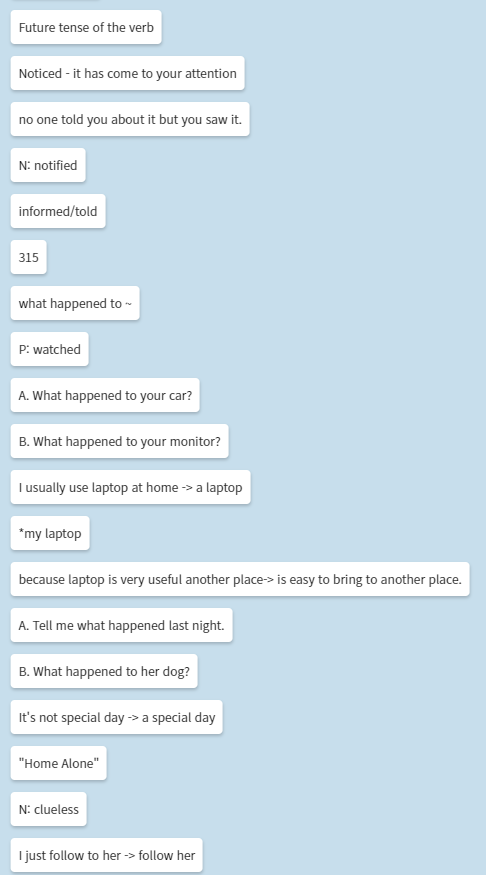 강사님과 전화 통화 하면서 간혹 못 알아 듣거나 내가 말한 표현이 맞나 싶을 때가 있지요? 채팅창을 통해 실시간으로 첨삭 받을 수 있는 점이 랭디의 최고 강점이 아닐까 싶습니다.