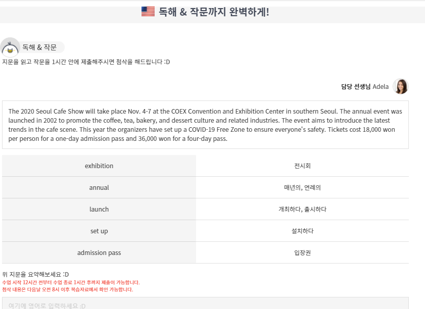 마지막에는 이렇게 작문 연습까지 할 수 있으니 적극 활용해 보세요! 단, 수업 시작 12시간 전부터 수업 종료 후 1시간까지만 제출 가능하다고 합니다. 전화 영어로 듣기/말하기/쓰기 모두 한번에~! 조금씩 이라도 꾸준함이 더 중요하겠죠~?