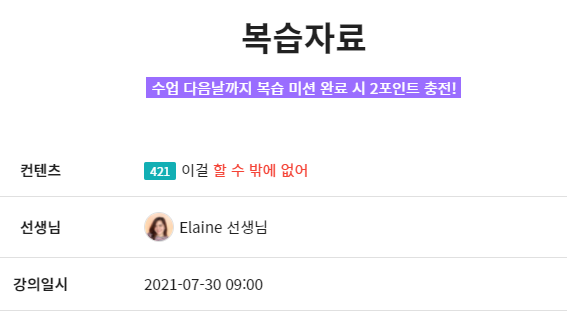 앞으로 복습 철저히! 작문 철저히 해볼랍니다!! 예전에 한번 Elaine 선생님과 수업하고 좋았던 기억이 나서 Elaine 선생님 수업을 수강하게 되었어요! 역시나 발음도 좋으시고 첨삭도 잘해주신답니다. 다만 수업하시는 시간이 다른 강사님에 비해 한정된 짧은 수업만 진행 하시기에 제가 원하는 시간에 딱 맞게 예약하기가 조금은 어려웠답니다~