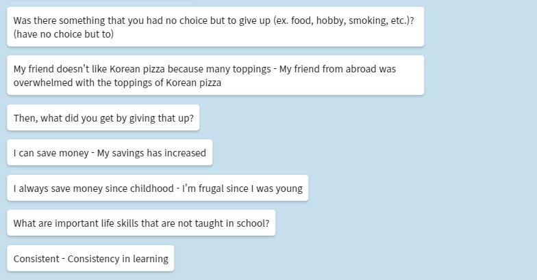 그리고 마지막 질문을 제가 잘못 이해하고 엉뚱한 답변을 했더라구요^^;; 배우는데 있어 가장 중요한 스킬이 뭐니?라고 물으신 줄 알았는데 수업 끝나고 채팅창을 보고 나서 질문을 이해했어요 허허..;; 이래서 첨삭 채팅창이 너무 좋다니깐요~😆그럼 이제 이전 수업 내용 총 복습하는 시간 가져볼게요! 뾰로롱~ (내돈내산으로 투자하는 만큼 복습도 철저히!)